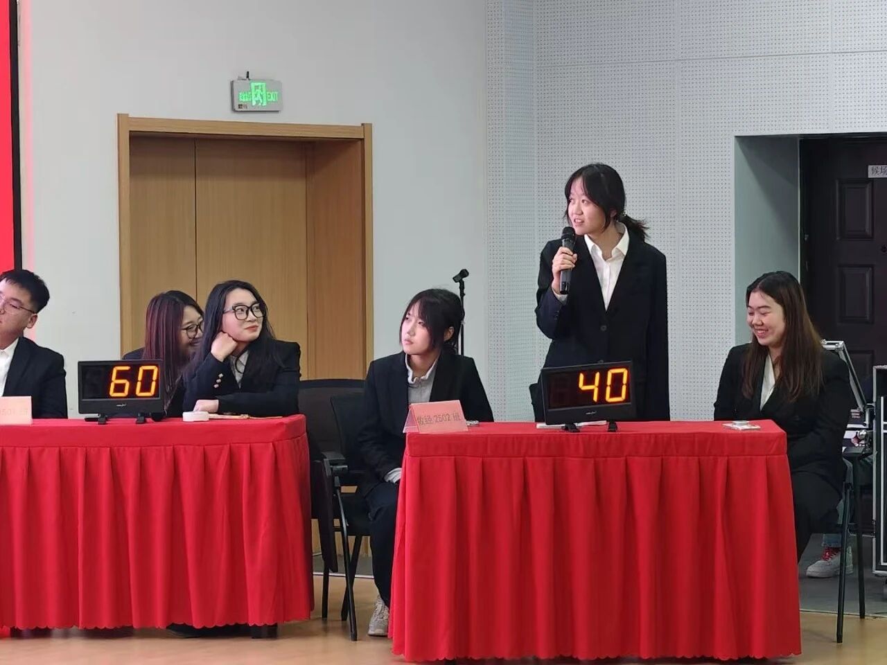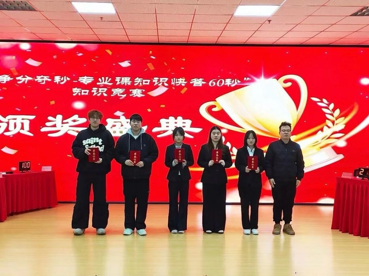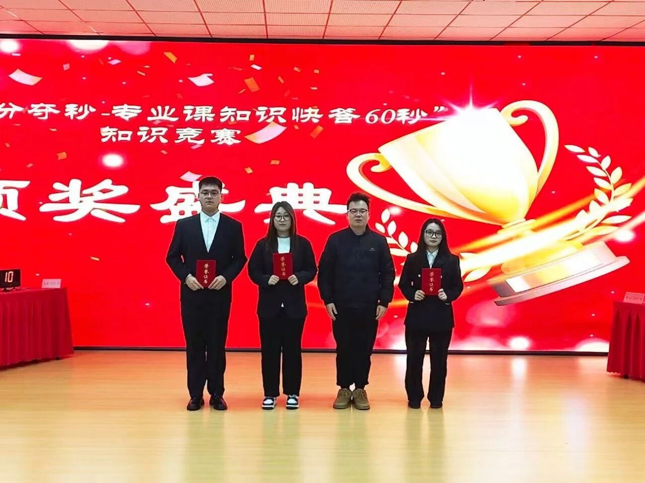 比赛现场气氛紧张而热烈,分为必答题、抢答题和简答题三个环节。在必答题环节,各参赛队伍依次作答单选、判断、填空类题目,选手们沉着思考、精准作答,展现出扎实的专业基础知识;抢答题环节中,选手们眼疾手快,借助抢答器展开激烈角逐,面对多选、判断、简答类题目,大家快速反应、积极应答,现场比分交替上升,气氛推向高潮。最终金融2501班荣获一等奖,金融2502荣获二等奖,数字经济2501荣获三等奖,数字经济2502、互联网金融2501荣获优秀奖。