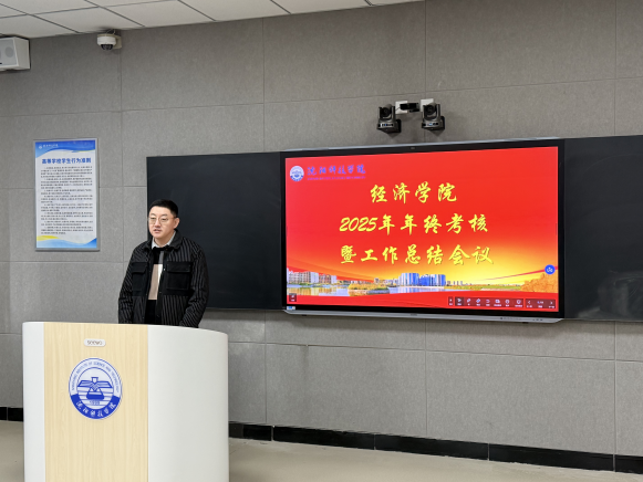 会上,学院院长管迪首先作2025年度工作总结报告。他指出,2025年是学院高质量发展的攻坚之年,在全体师生的共同努力下,学院在教学改革、学科建设、科研创新、人才培养等核心工作领域均取得显著进展。教学方面,持续深化课程体系改革,推进线上线下混合式教学模式创新,教学质量监控体系不断完善;学科建设上,聚焦经济领域前沿方向,加强学科团队培育,学科影响力稳步提升;科研工作成效突出,各类科研项目申报数量与质量双提升,科研成果转化迈出新步伐;同时,管迪院长也客观分析了工作中存在的短板与不足,并围绕学院发展目标,对2026年重点工作进行部署。他强调,2026年学院将重点推进四项工作:一是深化教育教学改革,加强一流专业与课程建设,提升人才培养精准度;二是强化学科内涵建设,凝练学科特色方向,打造高水平科研创新团队;三是加大师资队伍建设力度,完善人才引进与培养机制,提升教师综合素养;四是优化学生培养体系,加强思想政治教育与创新创业指导,助力学生全面成长成才。