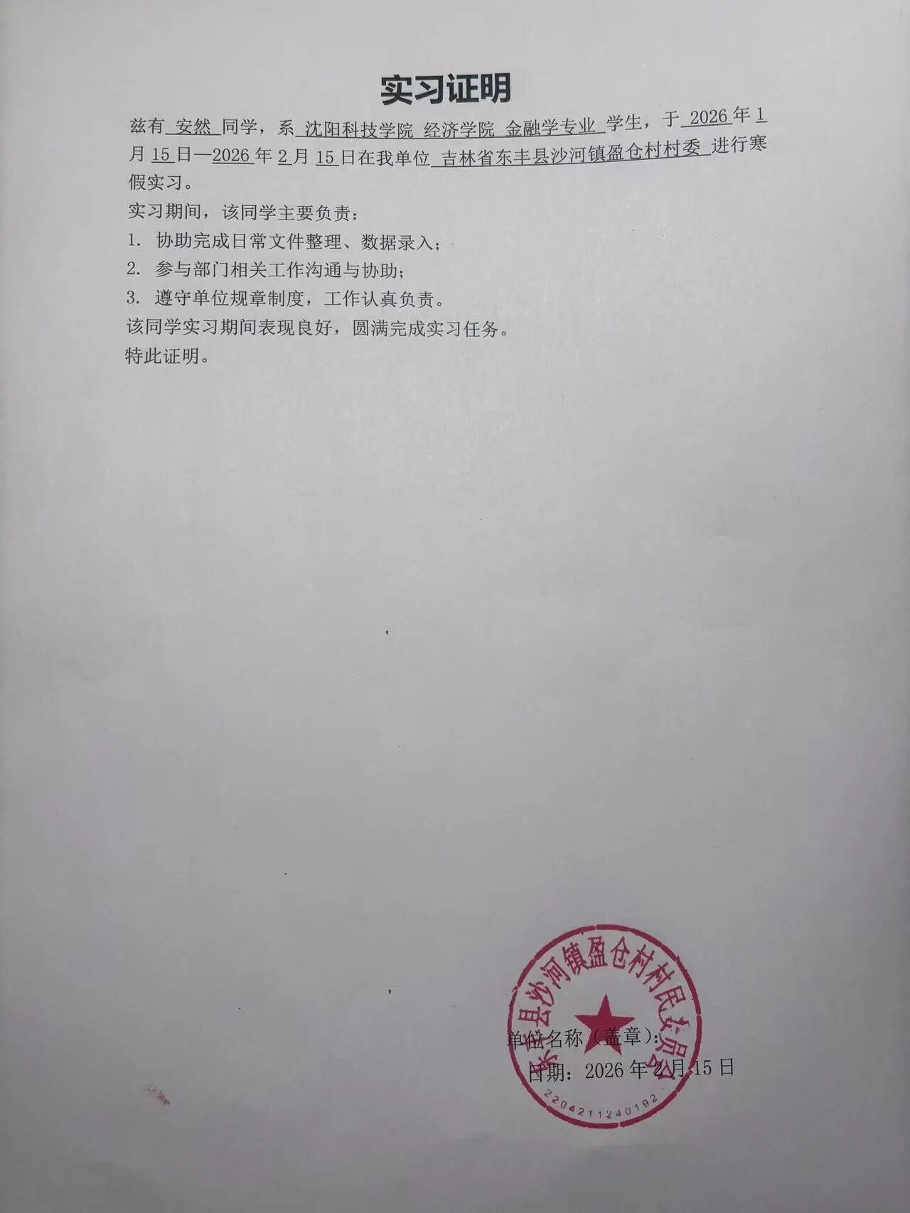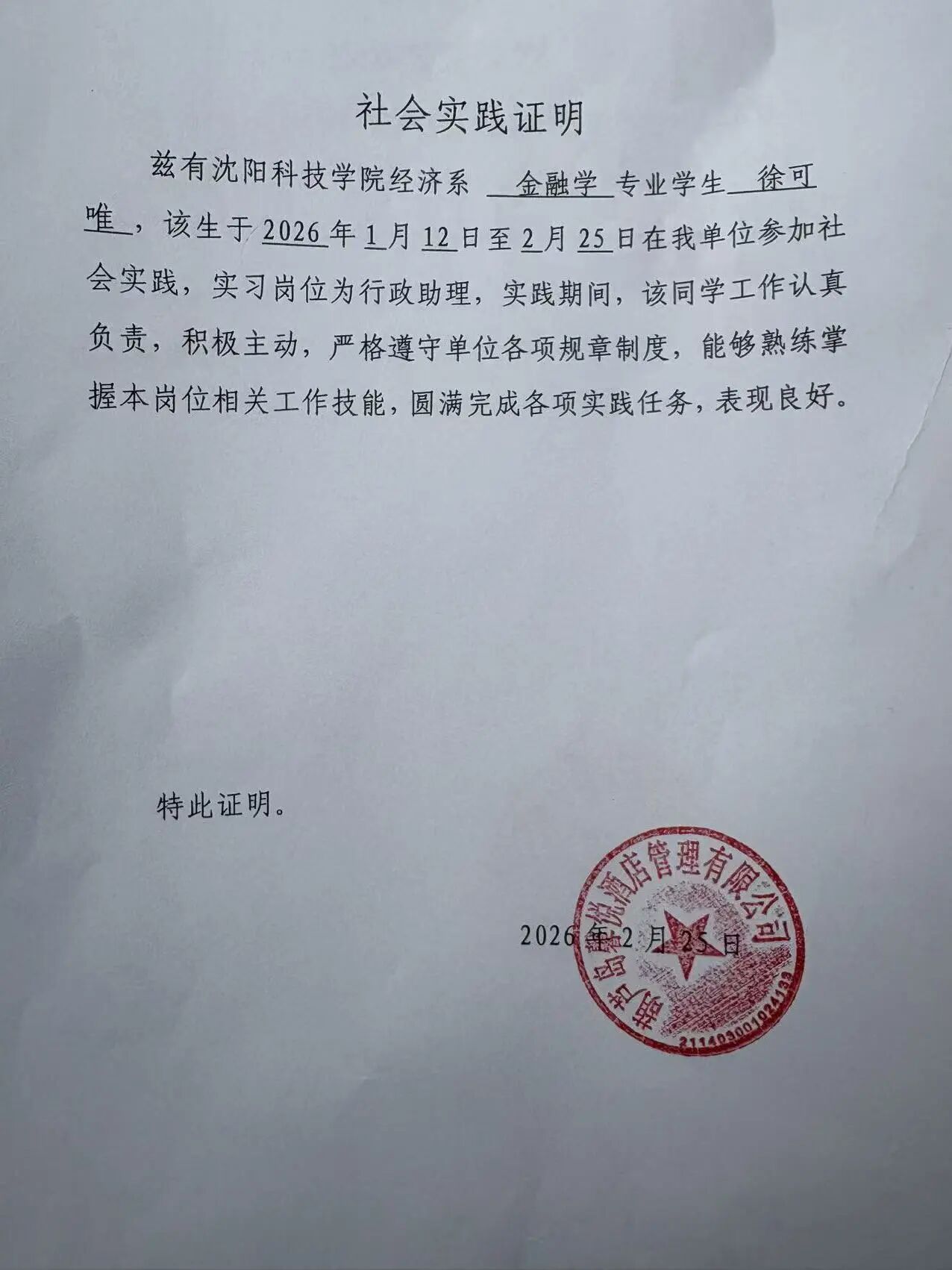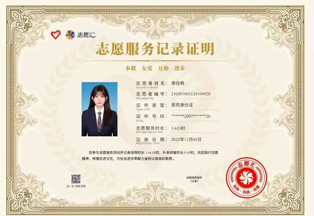 本次实践让我走出校园、走进社会、扎根家乡,在实践中受教育、长才干、作贡献,不仅提升了个人综合能力,也增强了家国情怀、责任意识与服务意识。未来,我将继续保持踏实努力的学习态度与积极奉献的服务精神,不断提升自我,努力成长为有理想、敢担当、能吃苦、肯奋斗的新时代青年,用所学知识回报家庭、回馈母校、服务家乡、奉献国家。