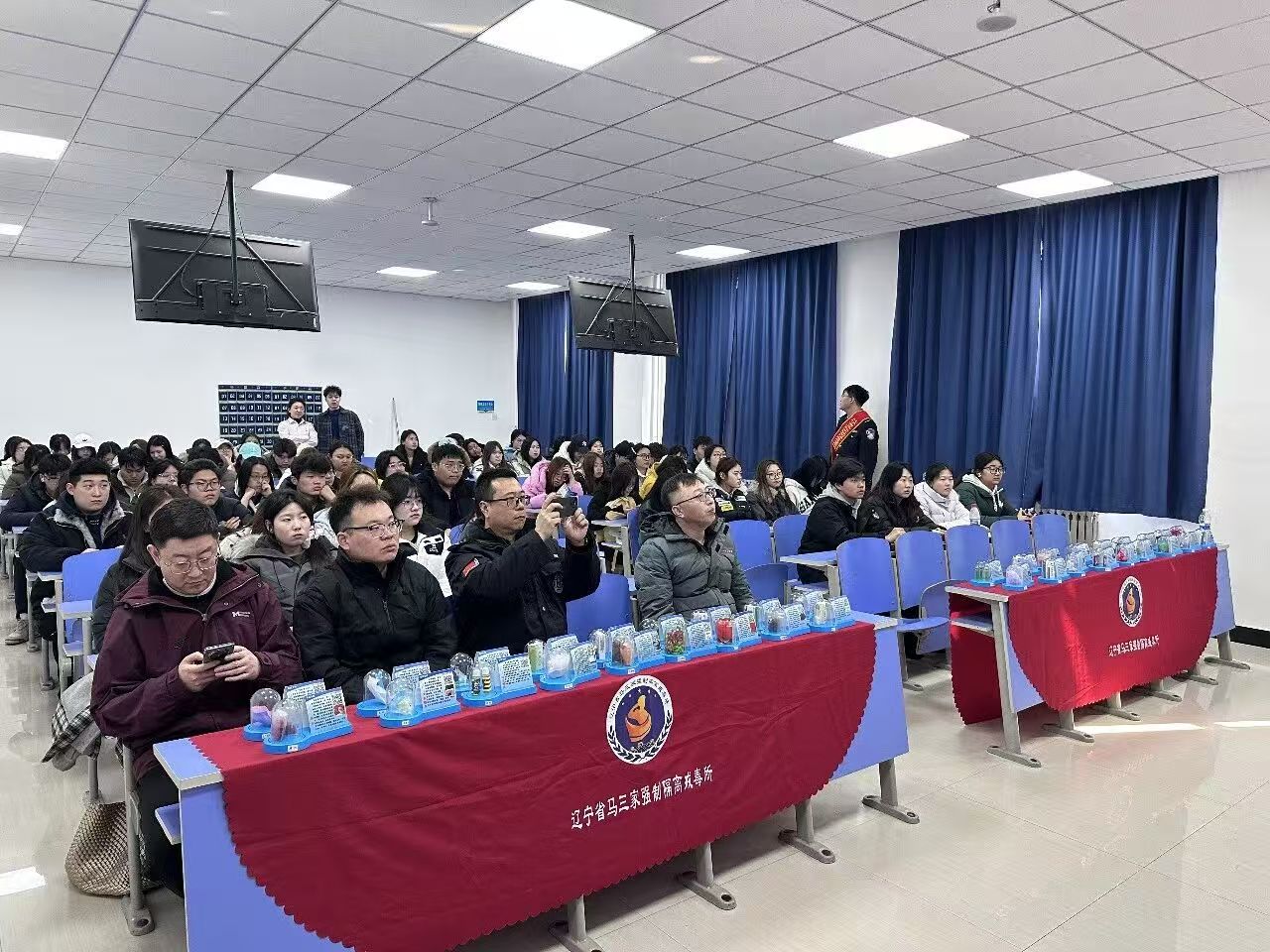 戒毒所民警以自身工作经历为切入点,讲述了奋战在禁毒一线的英雄事迹。他们用真挚的语言,还原了禁毒民警在隐蔽战线与毒贩斗智斗勇、坚守岗位守护一方平安的动人场景,讲述了那些为禁毒事业默默奉献、甚至牺牲自我的英雄干警的故事,让在场学子深刻体会到平凡岗位上的英雄担当。民警强调,英雄从不是遥不可及的符号,而是在危难时刻挺身而出、在平凡岗位上坚守奉献的普通人,禁毒一线的每一位干警,都是守护人民幸福、捍卫社会安宁的无名英雄。戒毒所民警通过PPT演示、案例剖析、仿真模型展示等多种形式进行科普宣讲,详细讲解了传统毒品、新型毒品的种类及伪装特征,重点解析了“上头电子烟”“奶茶粉”等新型毒品的迷惑性的危害,深入剖析了青少年涉毒的高危场景与防范技巧。同时,民警结合经济领域可能出现的毒品相关违法犯罪案例,提醒学子们警惕毒品陷阱,树立正确的金钱观、价值观,自觉远离毒品,守护自身青春与人生航向,筑牢校园禁毒防线。