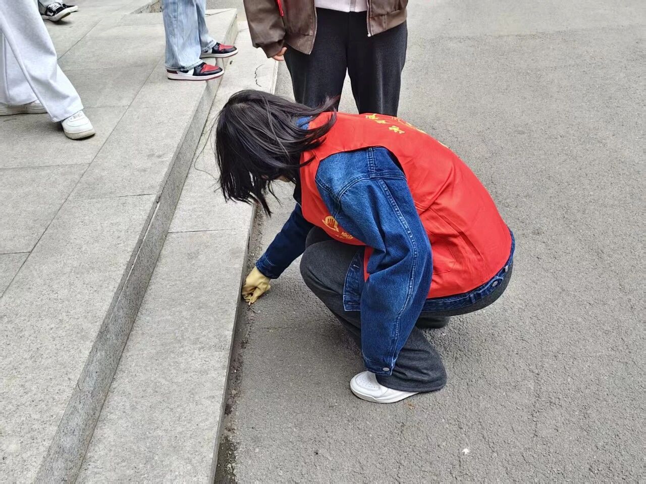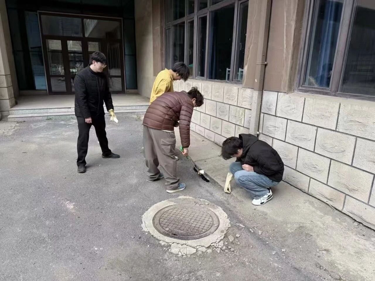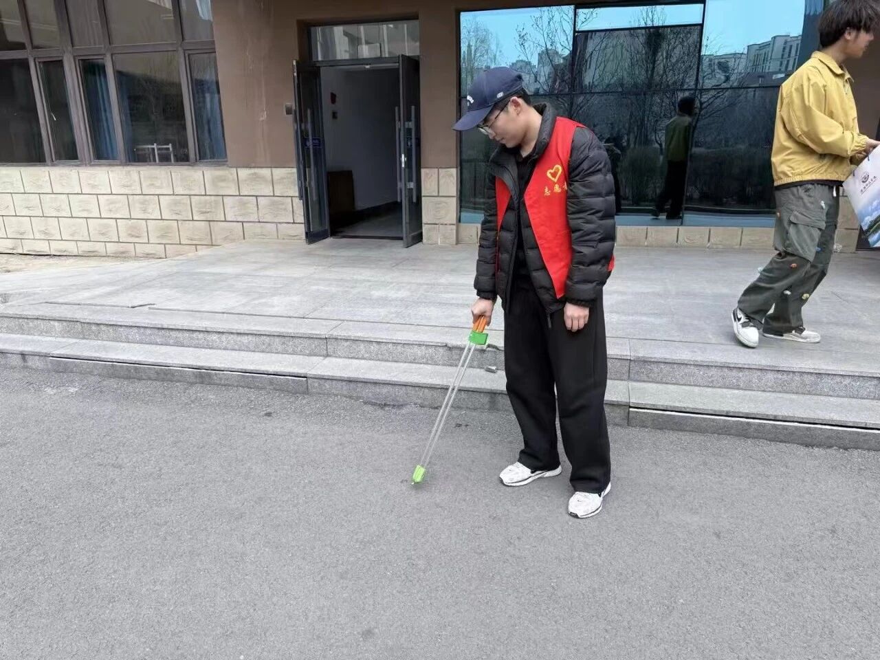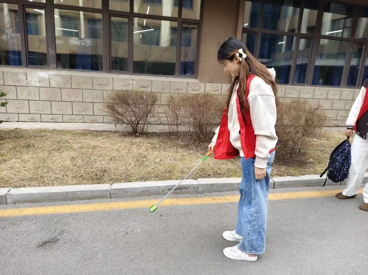 活动现场,志愿者们手持垃圾袋、夹子等工具,认真清理一教门口及周边区域的烟头。大家分工协作,不放过任何一处卫生死角,弯腰捡拾、分类投放,用实际行动为校园环境“美容”。通过志愿者们的努力,校园公共区域的环境卫生得到明显改善,路面变得干净整洁。