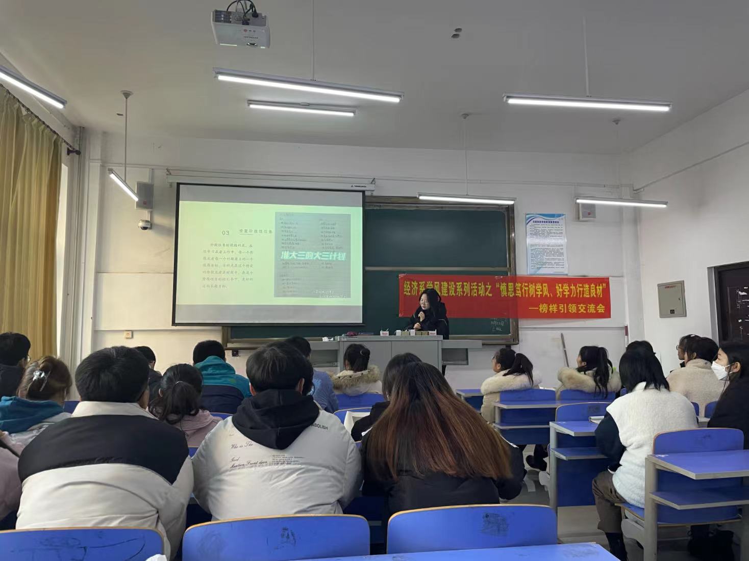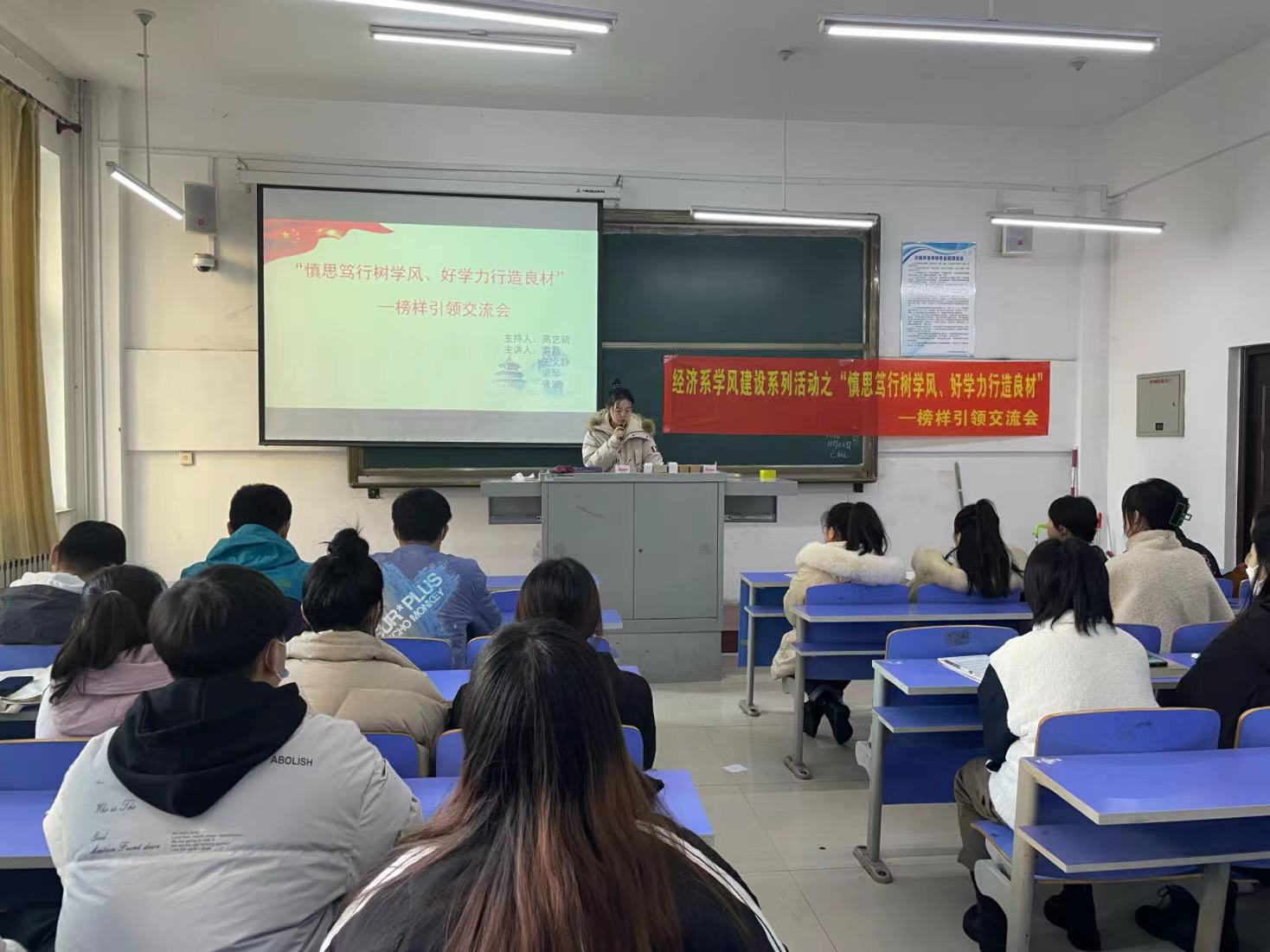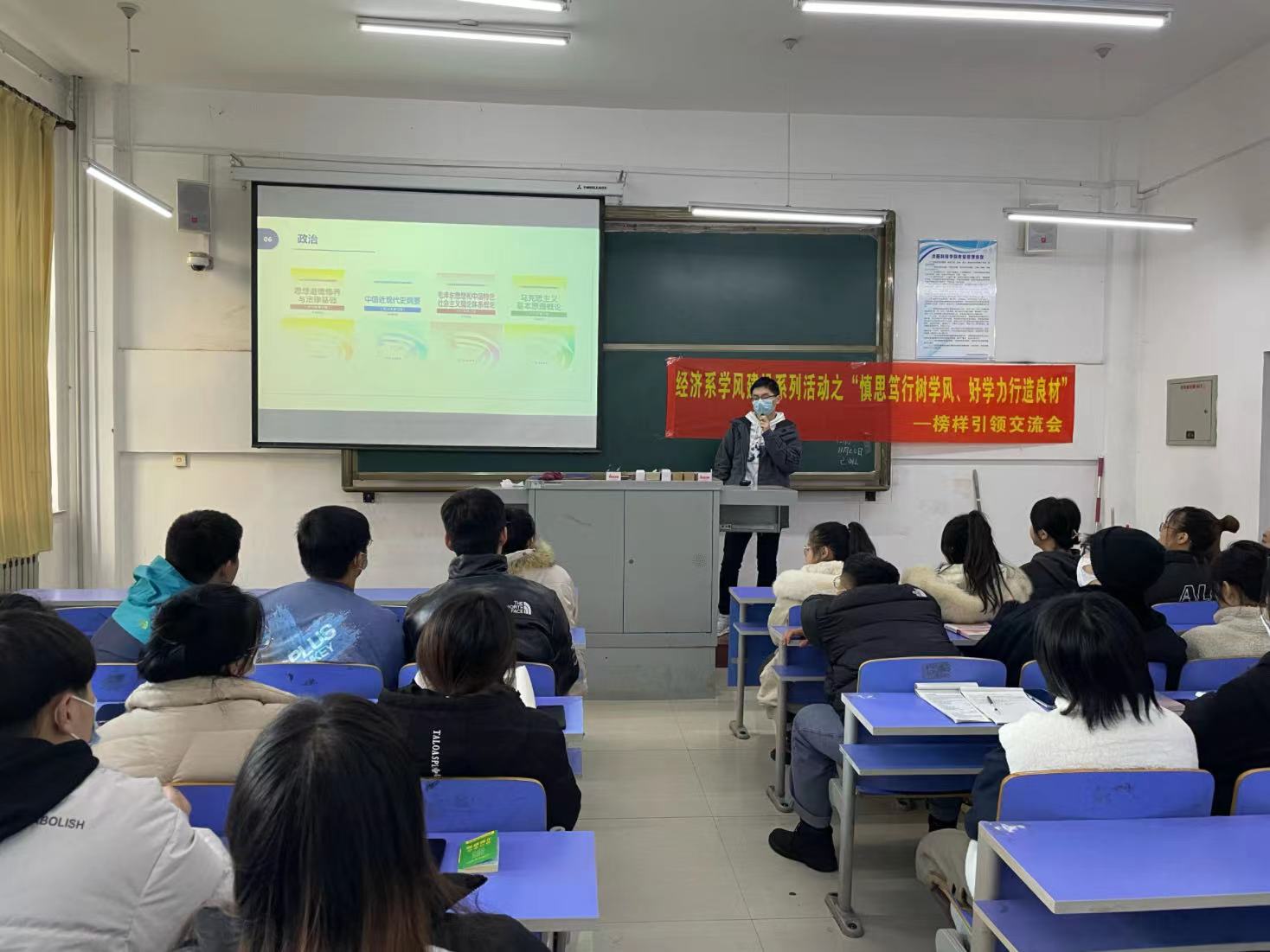 为进一步推进大学生素质教育,发挥优良学风促进人、熏陶人、鼓舞人的作用,充分营造奋发向上的学期氛围和良好的学习环境;我系于十一月下旬,面向经济系2019级、2020级的15个班级,开展了“慎思笃行树学风、好学力行造良材”榜样引领交流会。此次交流会邀请荣获过国家奖学金、省政府奖学金、励志奖学金、三好学生以及荣获过多项省级以上创新创业比赛的优秀学生,分别从思想方面、学习方面、生活方面、文体活动方面、社会实践、未来规划等多方面展开交流学习,以榜样引领,凝聚榜样力量,此项活动在展现我系优秀学生的同时,也激励广大同学共同学习,共同进步。
