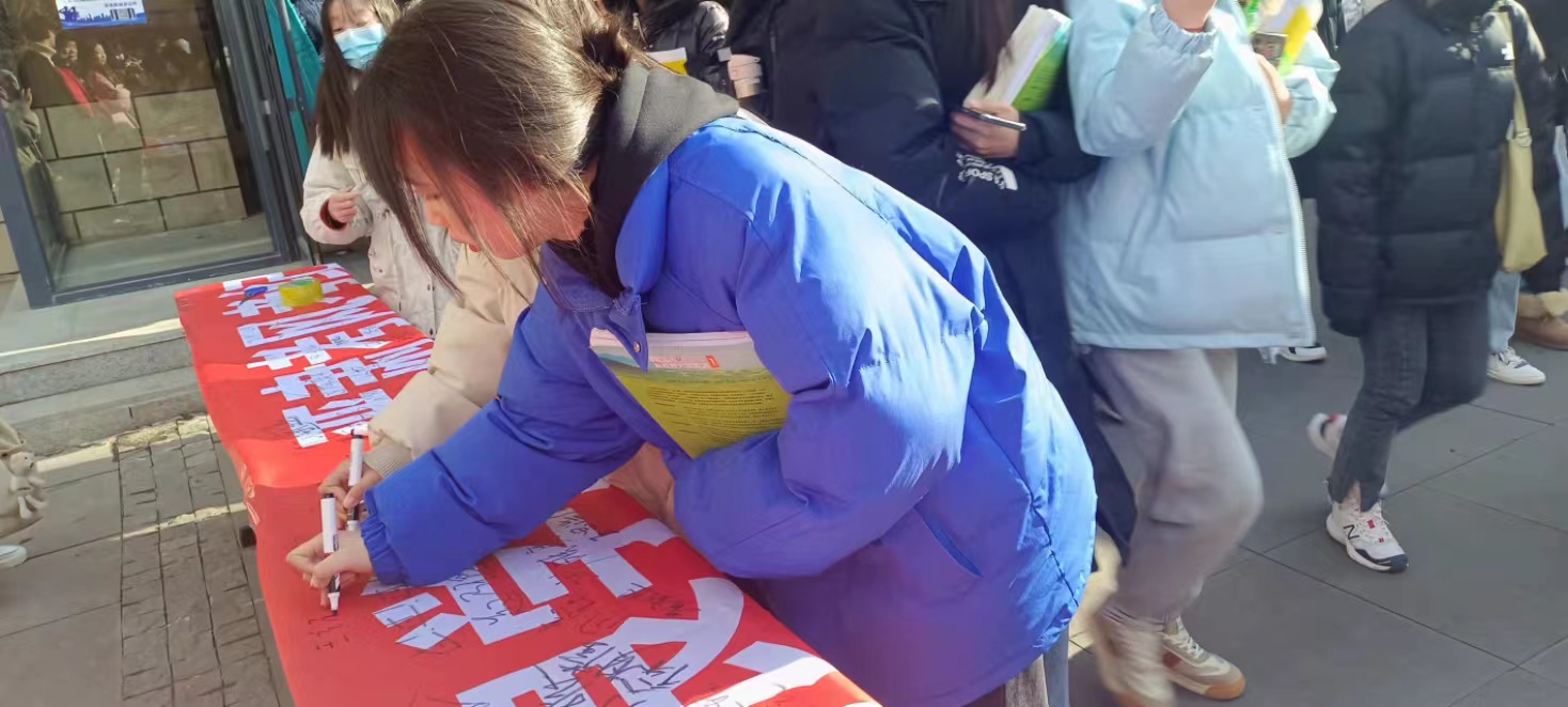 在活动现场,同学们积极踊跃,纷纷在条幅上庄严地签上自己的名字,签字仪式的整个过程秩序良好,条幅上满满的都是同学们留下的字迹。通过此次签字活动的开展,进一步强化了学风建设的基石,筑牢了诚信考试的底线思维。