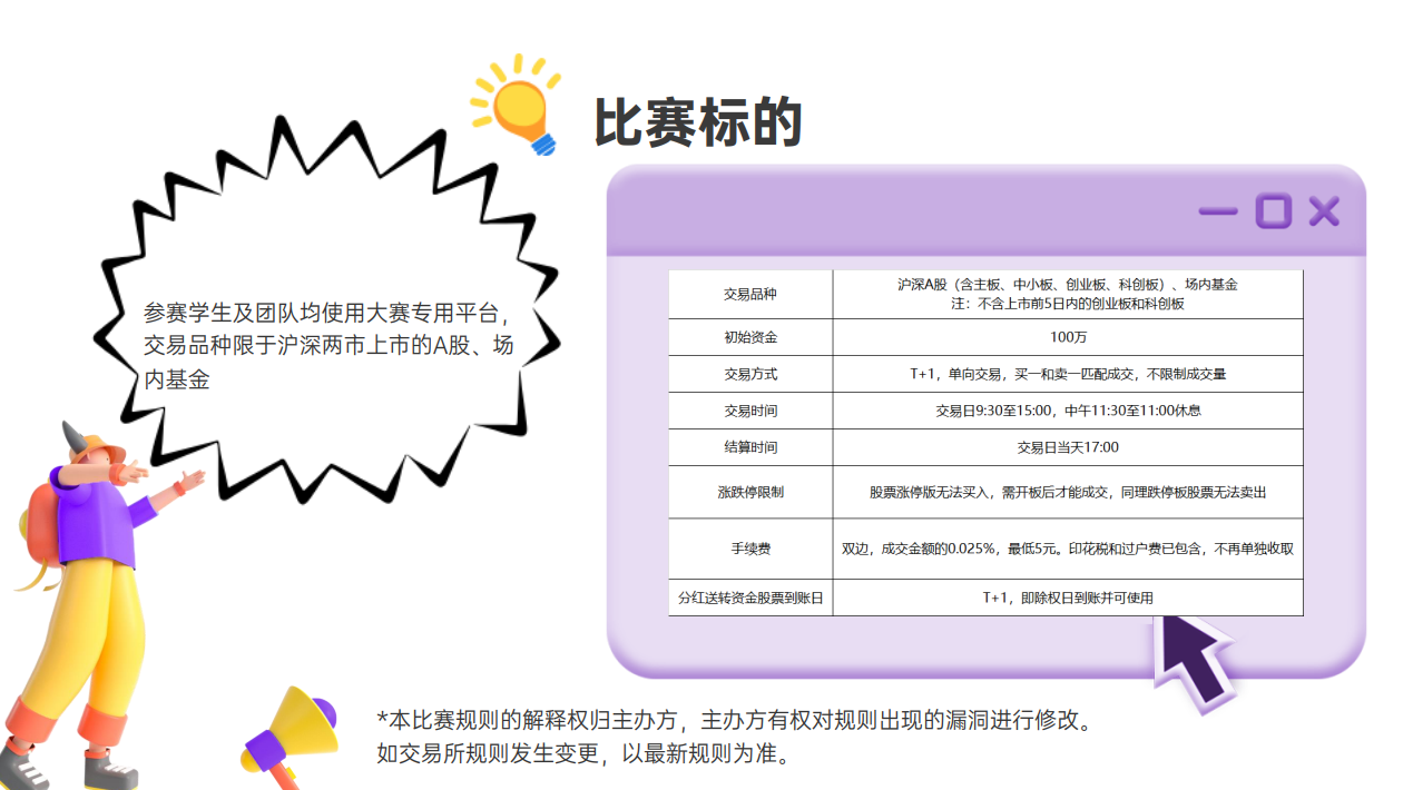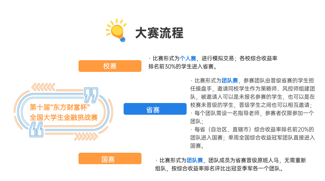 1.在校赛阶段,学生以个人名义参赛,进行模拟交易。综合收益率排名前30%的学生进入省赛。