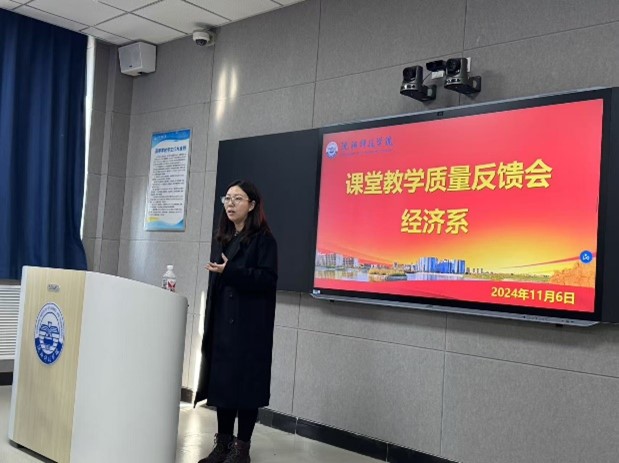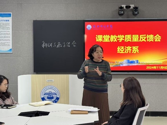 为加强课堂教学质量监控,切实提高教师教学水平,11月6日下午,经济系在第二教学楼智慧教室召开了课堂教学质量反馈会,副校长张丽影,经济系主任管迪,教学主任李贺,校级教学督导岳玉珠及我系全体教师参加了本次会议,会议由李贺主持.