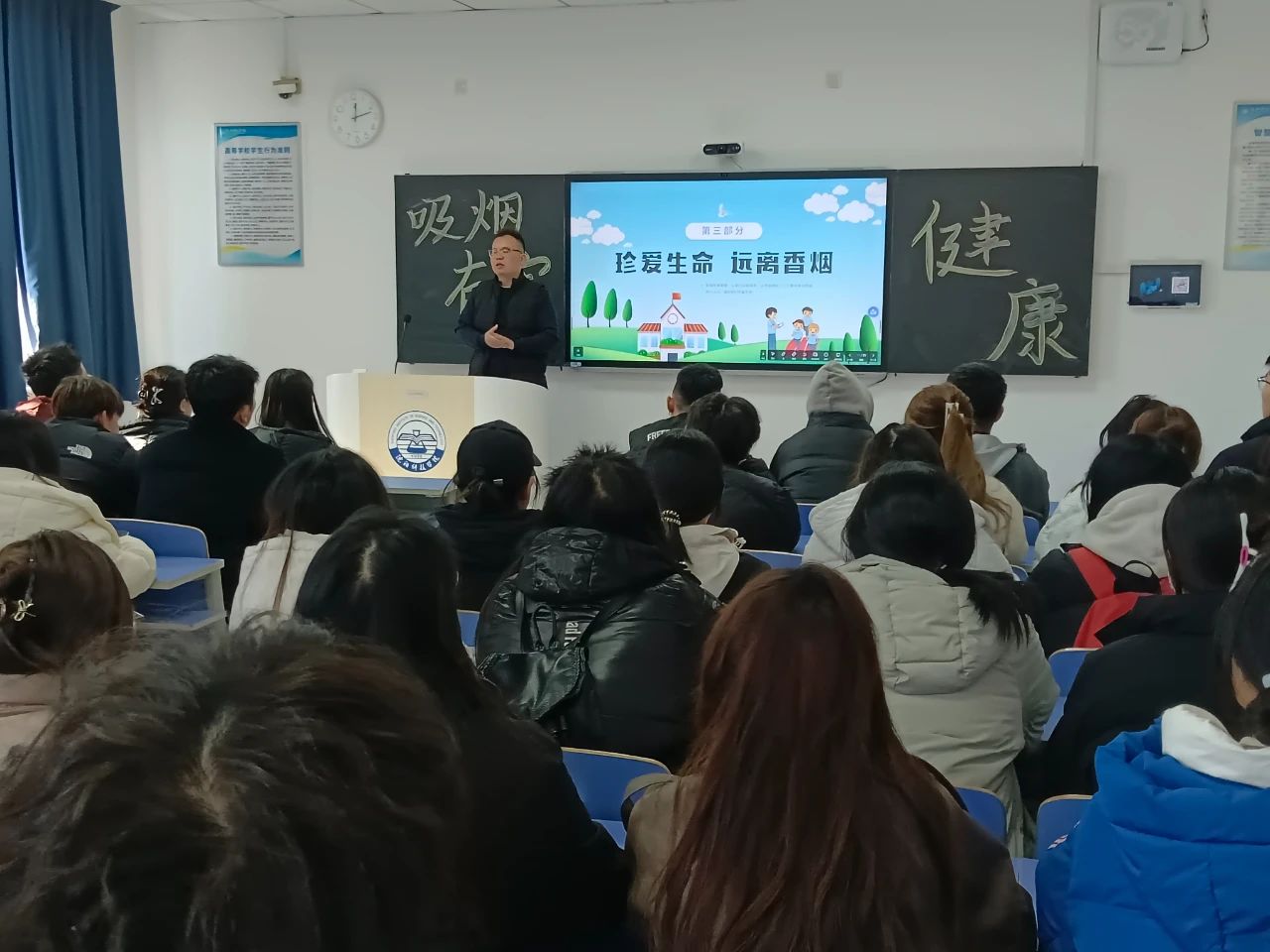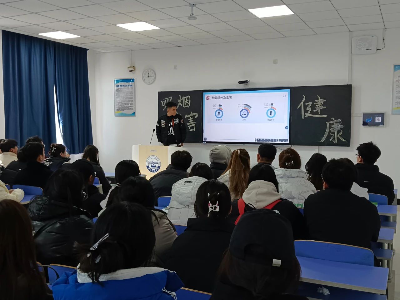 班会上,2022级辅导员马雯放为学生们介绍了吸烟对身体健康的具体影响,包括对肺、心脏、血管等器官的损害,让学生们充分意识到了吸烟对自身的伤害,并告诉学生二手烟对周围人,尤其是儿童和孕妇的危害,让大家知道了吸烟也会对他人造成伤害;2023级辅导员黎明东组织学生讨论了吸烟可能导致的长期健康问题,如肺癌、慢性阻塞性肺病、心脏病等,并进行了一些问答环节关于应如何采取行动去预防;经济系党总支书记2024级辅导员衣方丹通过分享吸烟者戒烟成功的故事,为想要戒烟的学生提供情感支持和鼓励,同时还邀请了几名有吸烟史的学生,分享个人故事以及对吸烟后自身状况的变化,让学生认识到吸烟对自身产生的不良影响,并展示了一些关于吸烟和健康的数据与统计,如吸烟导致的死亡人数、疾病发病率等,通过播放关于吸烟危害的短片及图片,生动形象地展示了吸烟的危害。