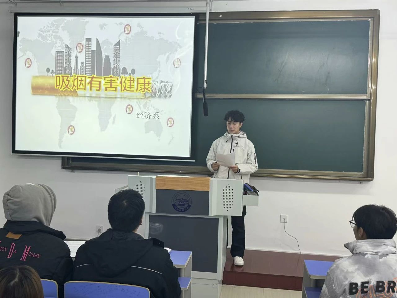 为进一步为营造文明健康的校园环境,帮助学生全面了解吸烟对个人健康、心理健康及社交环境的危害,激发学生对健康生活的向往,树立正确的生命观和健康观,增强自我保护意识,近日,经济系各年级开展了“吸烟有害健康”主题班会。