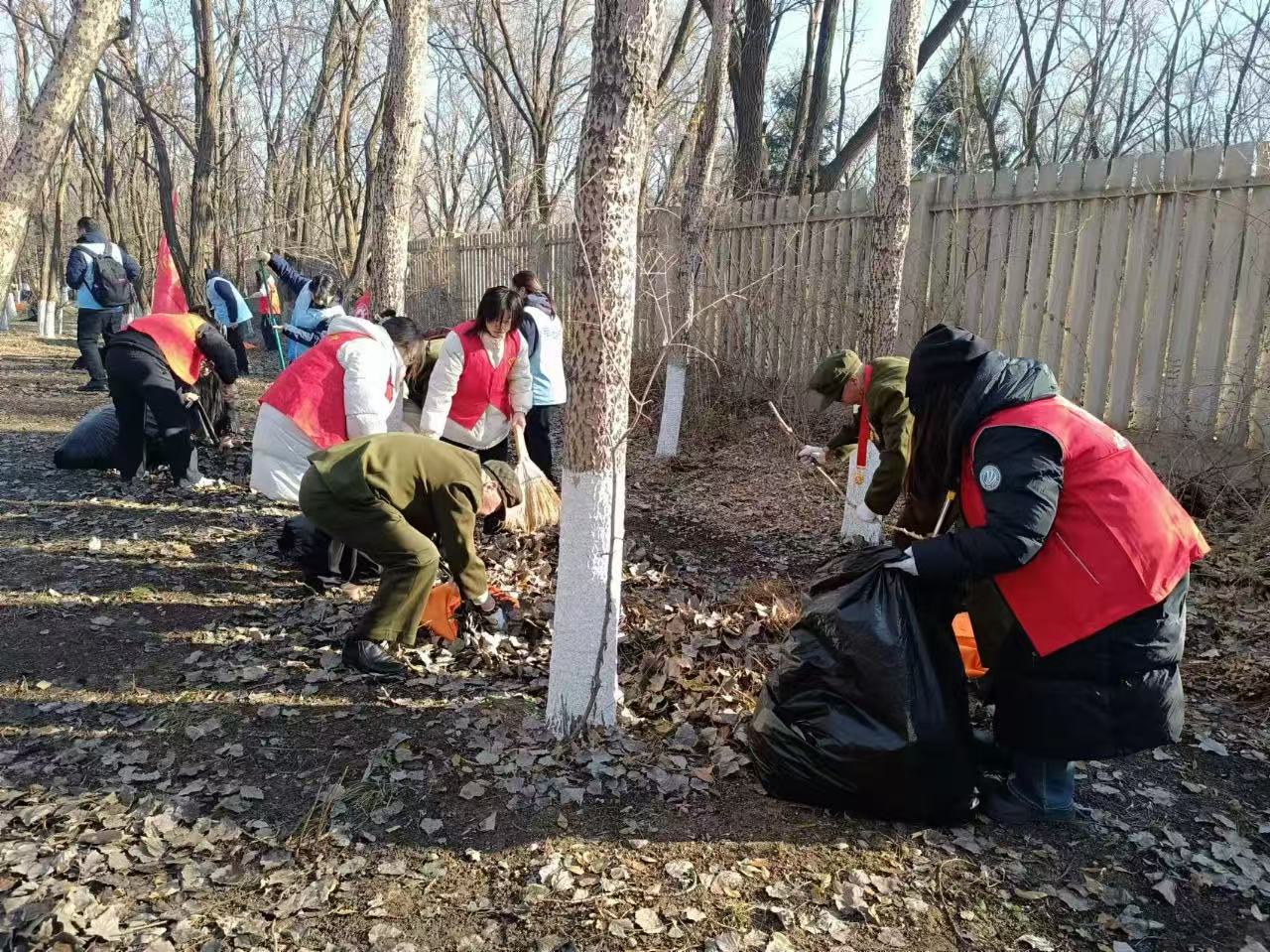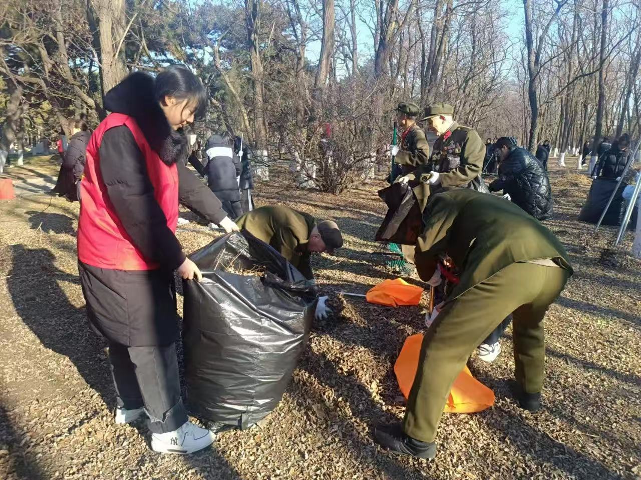 上午9时,经济系志愿者身穿红色马甲,在带老兵的带领下,怀着对革命先烈的敬仰之情,缓缓步入陵园;随后,各小组分工协作,拿起扫把、铁铲对陵园内的枯草、树叶、杂草、杂物进行了清理,为营造庄严、肃穆的陵园形象贡献一份力量。