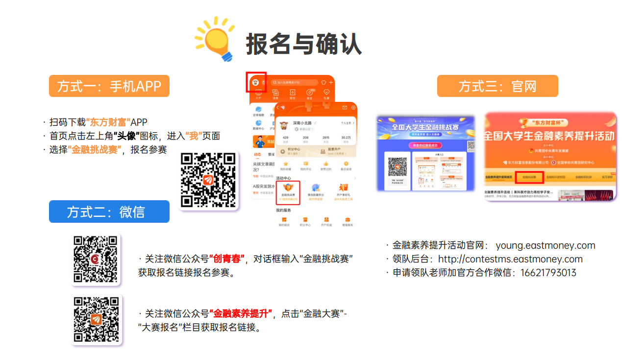 为学习贯彻习近平总书记关于金融工作的重要论述和中央金融工作会议、中央经济工作会议精神。 坚持实践育人导向,组织引导广大青年学生提高金融素养和投资实践能力,正确看待经济形势,正确认识做好科技金融、绿色金融、普惠金融、养老金融、数字金融“五篇大文章”的重大意义,唱响中国经济光明论,积极投身金融强国建设,建功立业、挺膺担当。我校决定举办第十届“东方财富杯”全国大学生金融挑战赛校内选拔赛。......