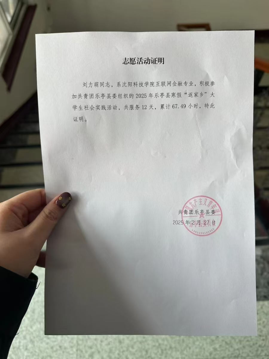 此次“返家乡”志愿服务活动是我大学生活中宝贵经历。在成平满族乡人民政府服务期间,我在奉献中成长,在实践中收获。深刻认识到家乡发展需求和基层工作意义,明确自身责任与使命。未来,我将继续关注家乡发展,积极参与志愿服务,为家乡建设添砖加瓦,也希望更多大学生投身“返家乡”活动,为乡村振兴注入青春力量。